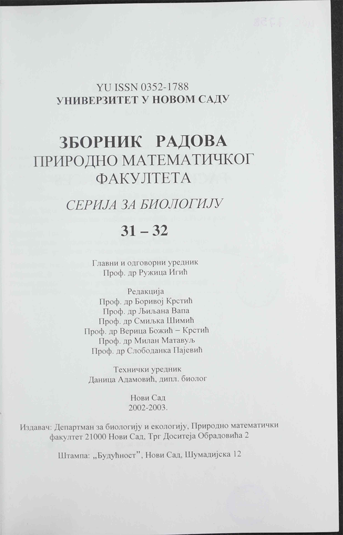 FORMER JOURNAL (PUBLISHED IN SERBIAN) Vol. 31-32 (2002-2003): ZBORNIK RADOVA PRIRODNO MATEMATIČKOG FAKULTETA – SERIJA ZA BIOLOGIJU